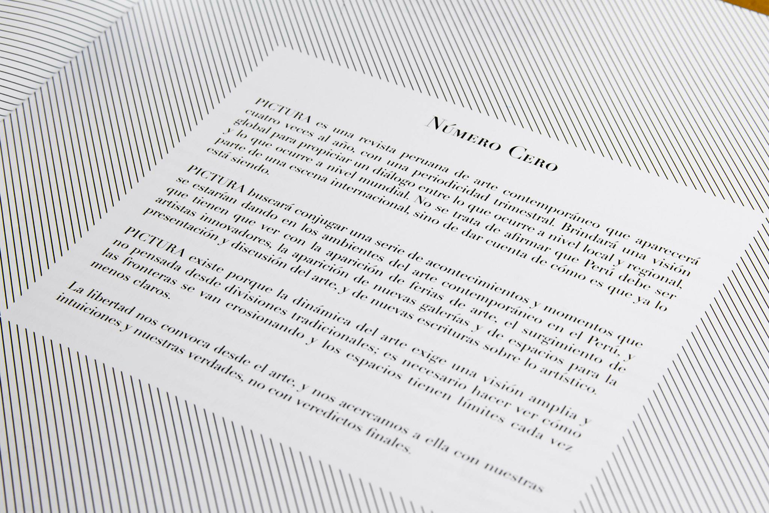 Para destacar la participación del Perú en la Bienal de Arte de Venecia, la fundación Wiesse nos pidió diseñar Pictura, una revista de arte dirigida por el reconocido curador Jorge Villacorta. Pictura conjuga la potencia visual de los artistas peruanos con la cómoda lectura de los textos para presentar un amplio repaso por plástica nacional.