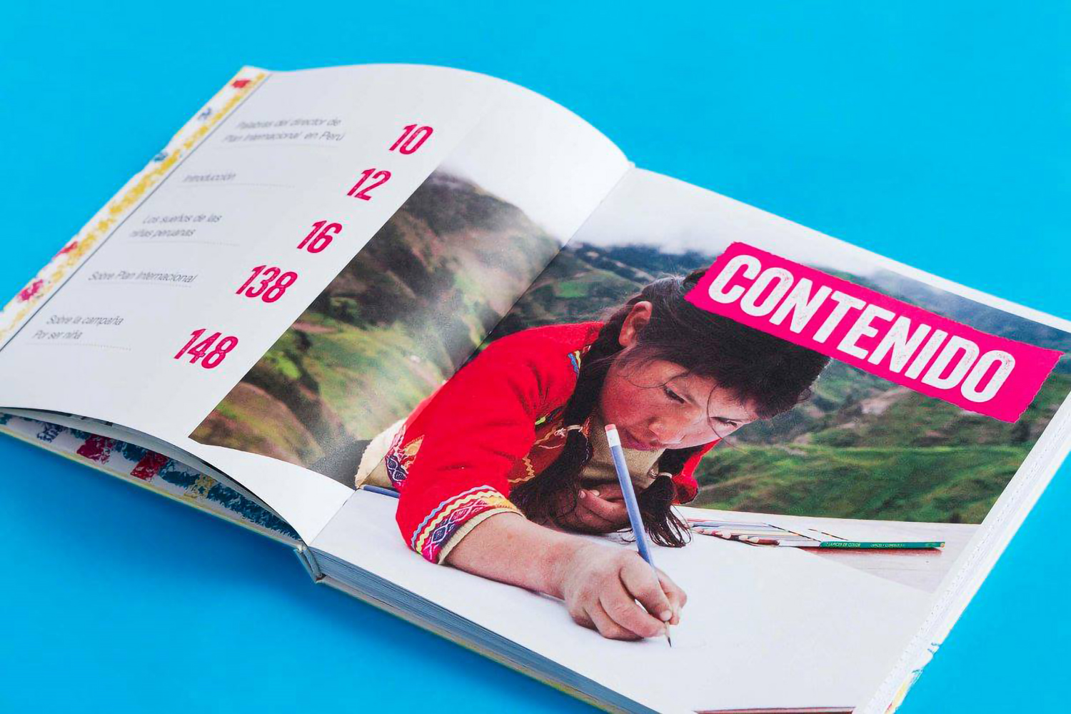 La ONG canadiense Plan internacional nos buscó para traducir visualmente los resultados de un proyecto de desarrollo que tuvo por finalidad la mejora de la calidad de vida de las niñas de la sierra sur del Perú. El libro no solo recopila las recomendaciones para alcanzar los fines de bienestar deseados, sino que además traduce compleja información estadística en contenido de fácil acceso.
